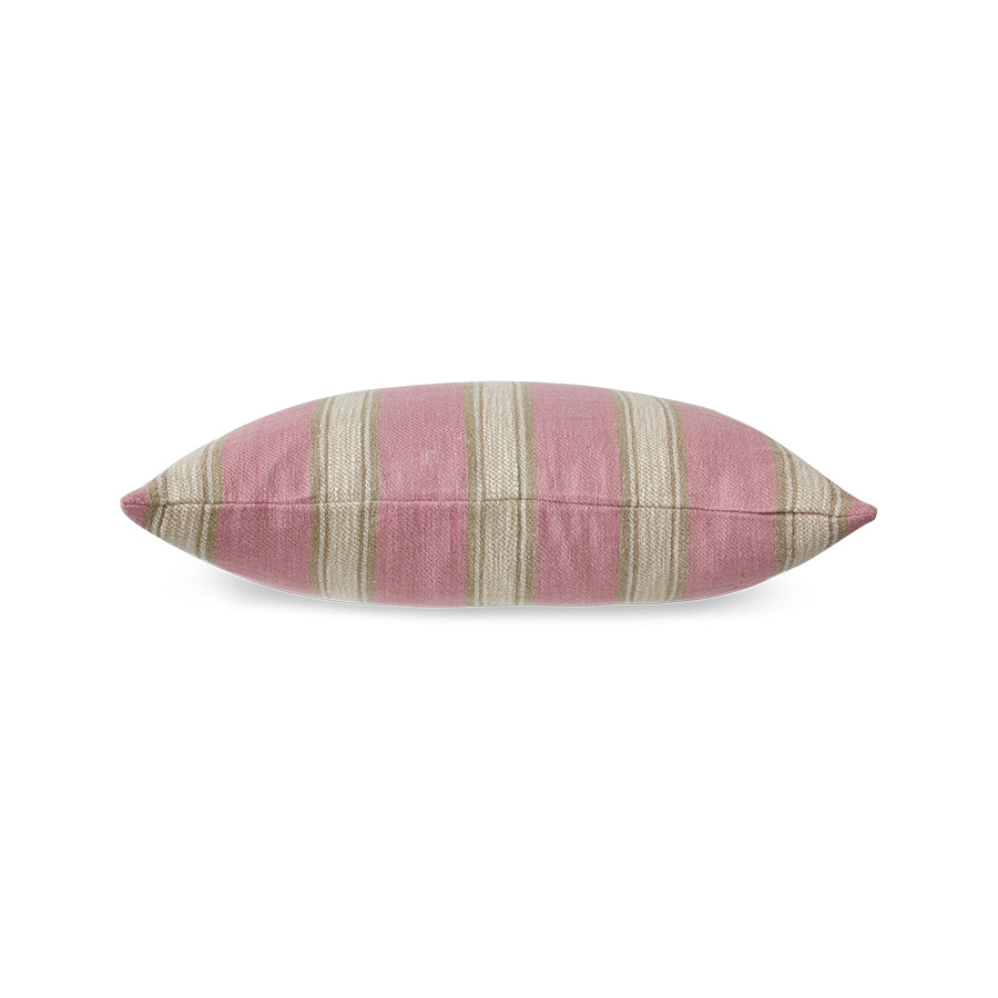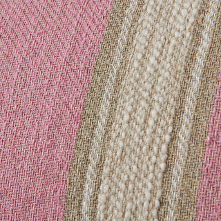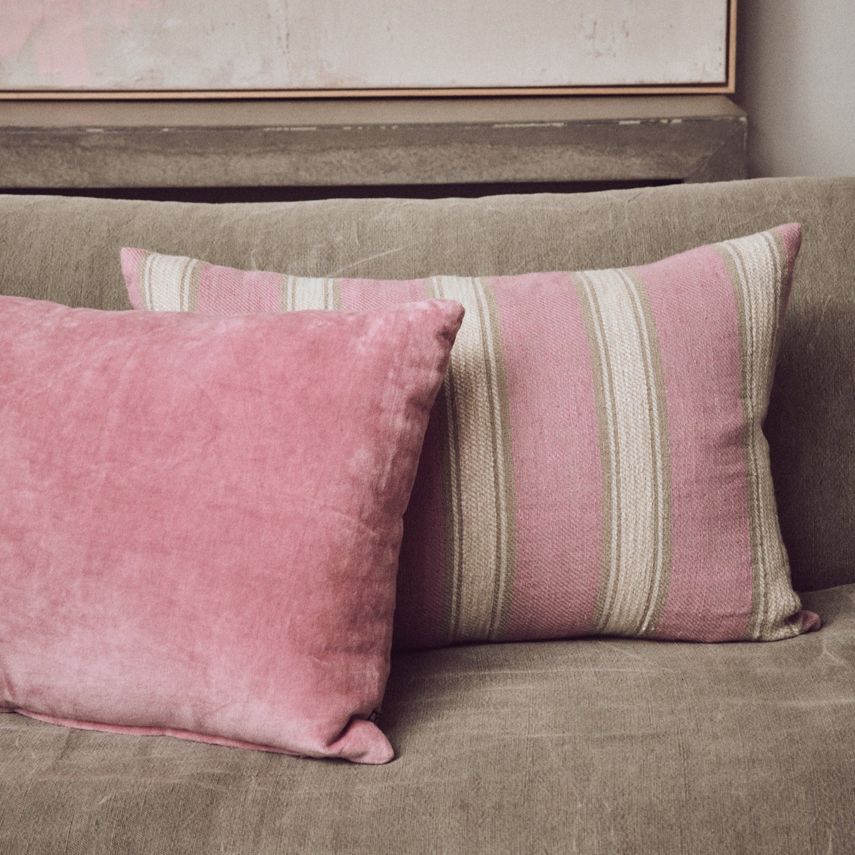 Elegant kudde med mjuka, vertikala ränder i blushrosa och krämvitt. Den taktila strukturen och dova färgskalan skapar en lugn och inbjudande känsla – perfekt för både minimalistiska och ombonade hem.